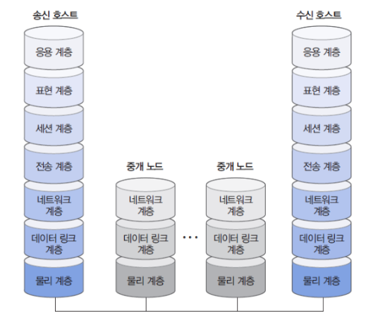 연결된 두 호스트는 각각 7개의 계층으로 구성된 모듈을 따라 데이터 송수신이 가능하다.