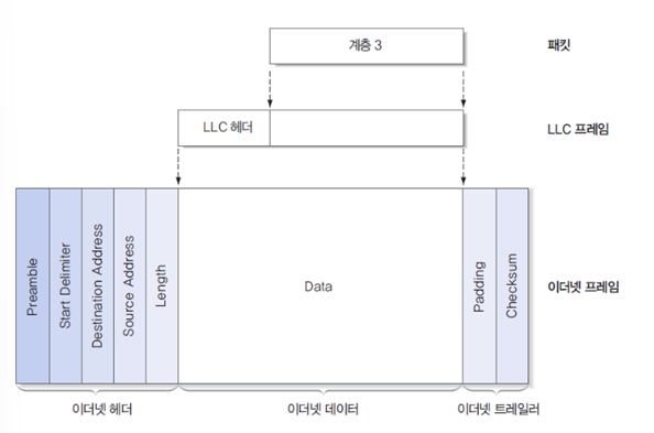 네트워크 계층에서 전송을 요구한 패킷은 LLC 계층으로 내려오면서, LLC 헤더 정보를 추가해 LLC 프레임이 된다.