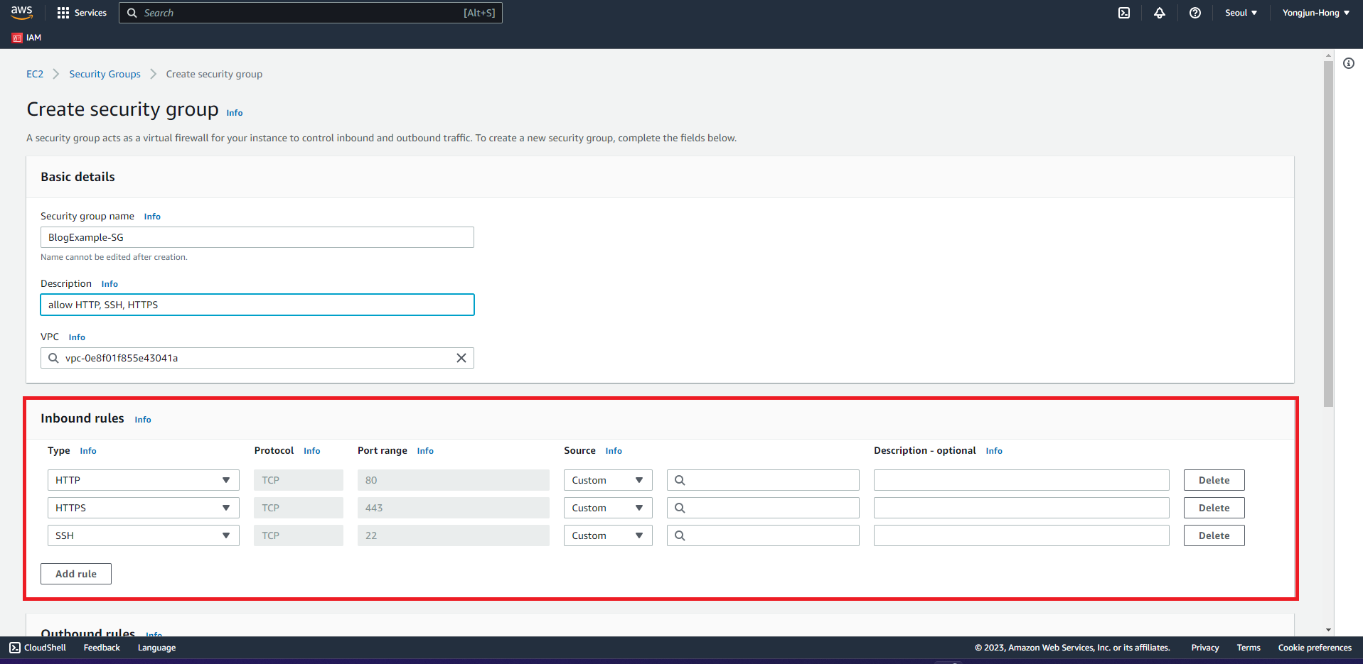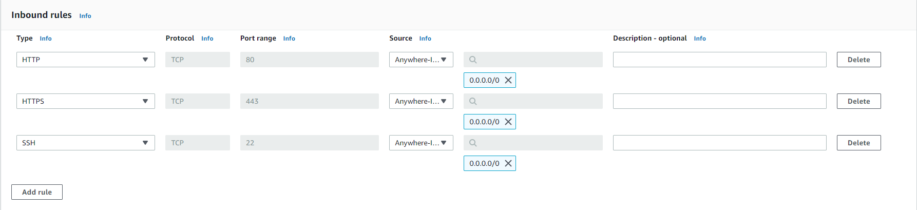 3. HTTP, HTTPS, SSH을 허용해야되기 때문에 Inbound rules에서 HTTP, HTTPS, SSH을 추가해준다.