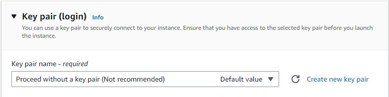 Key Pair은 보통의 경우에는 Key를 만드는 것을 추천하지만 이번의 경우에는 Test용도이기 때문에 Key를 만들지 않겠습니다. (권장하지 않는 방법)