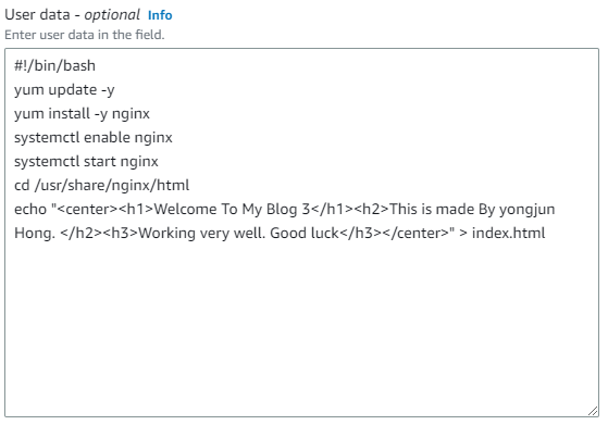 그런 다음에 인스턴스가 실행될 때 명령어 또는 스크립트를 지정해주는 User Data를 작성해줍니다.