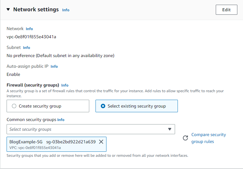 그런 다음에 방화벽에서 Select Existing Security Group을 누른 뒤, 아까 만들어준 방화벽을 적용시킵니다.