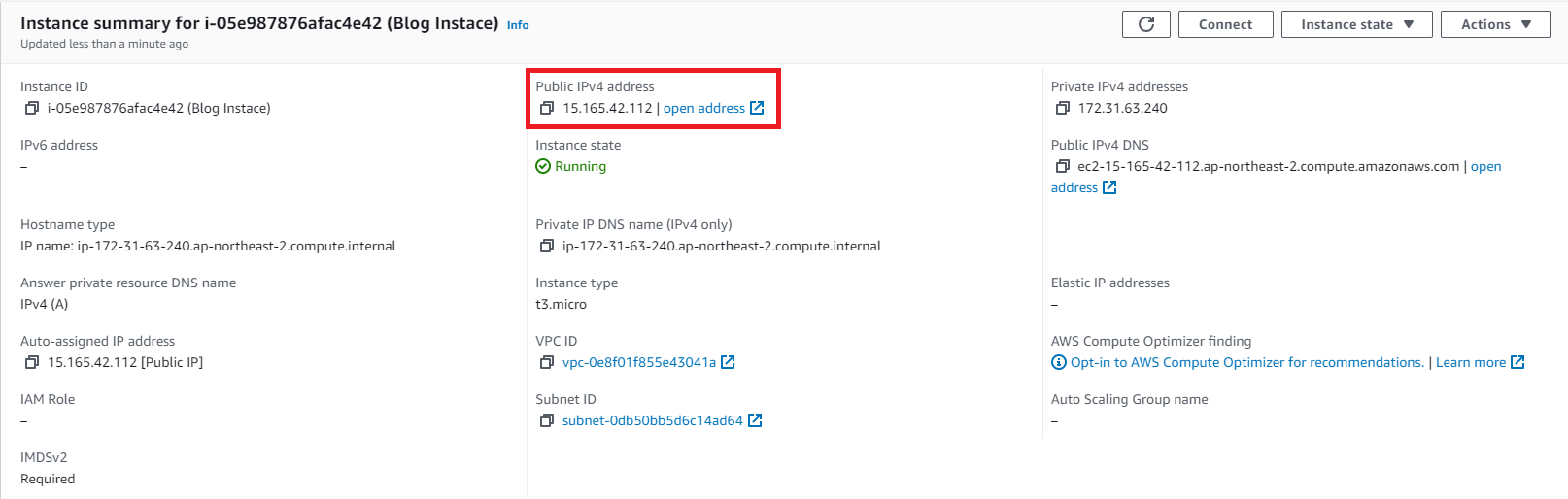 인스턴스 ID를 누른 뒤, Public IPv4 address를 복사 한 다음 URL창에 붙여넣기 했을때