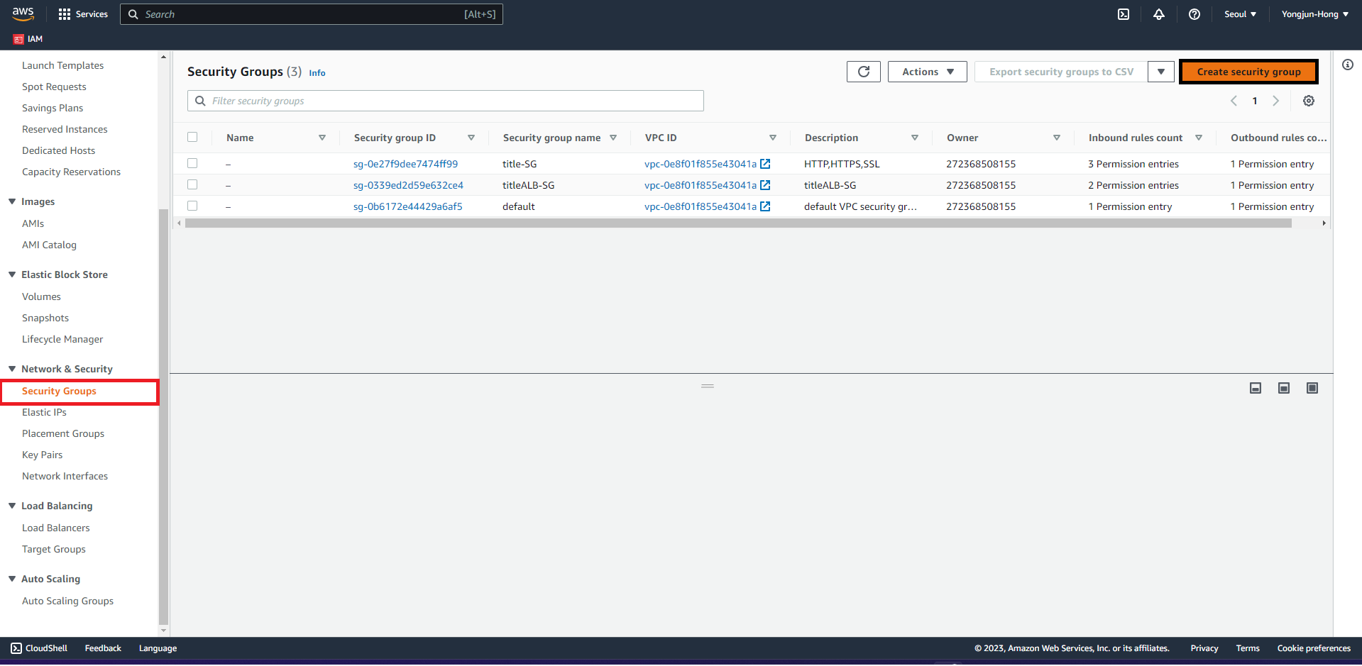 옆에 있는 메뉴바에서 Security Group을 고른 뒤, Create Security Group을 누른다.