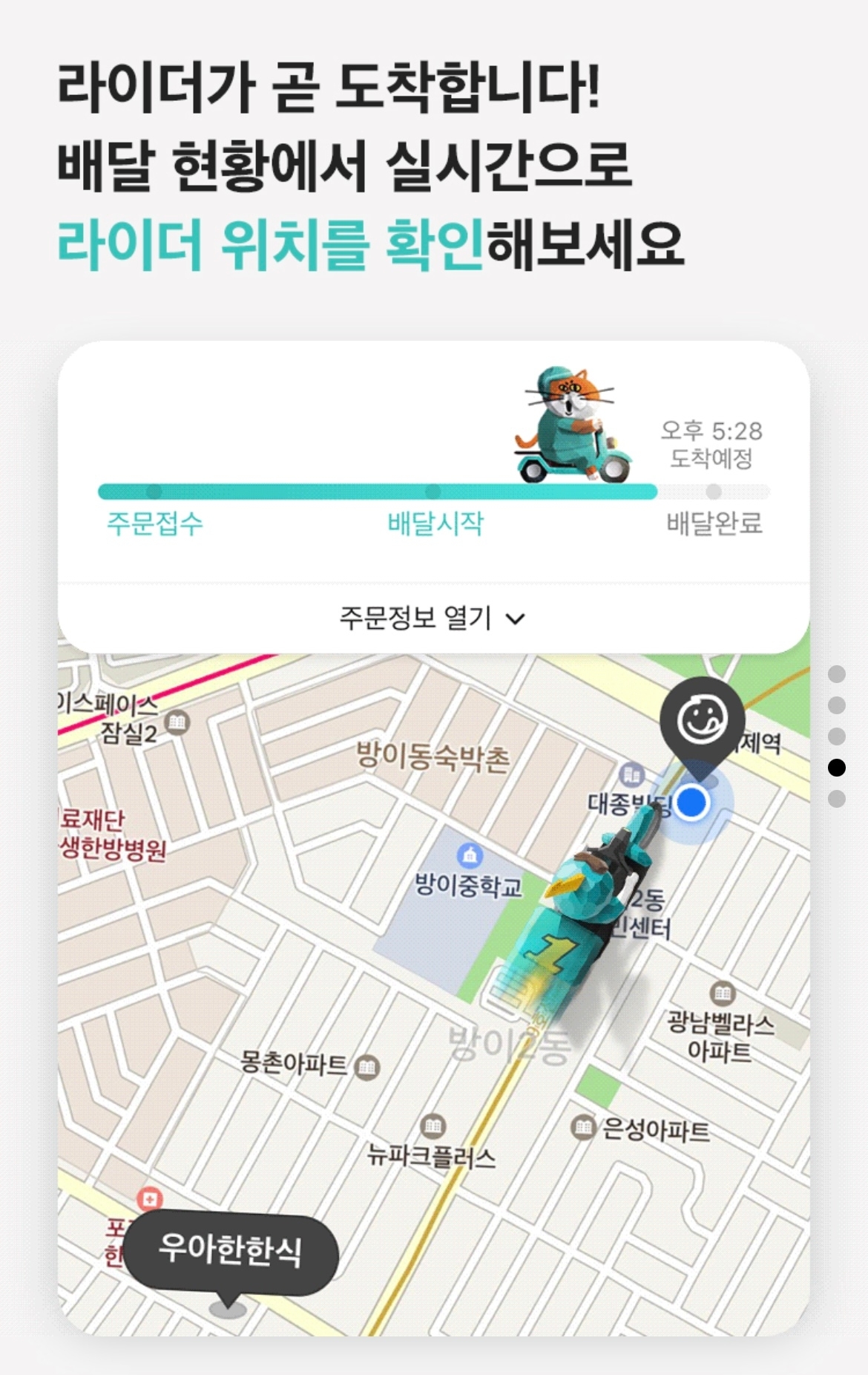 위 화면은 배달 기사님께서 배달 오시는 위치를 나타낸 그림입니다.