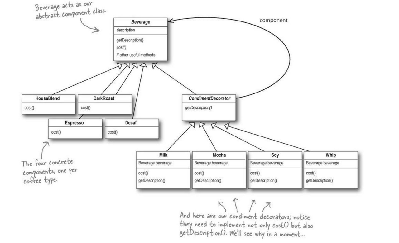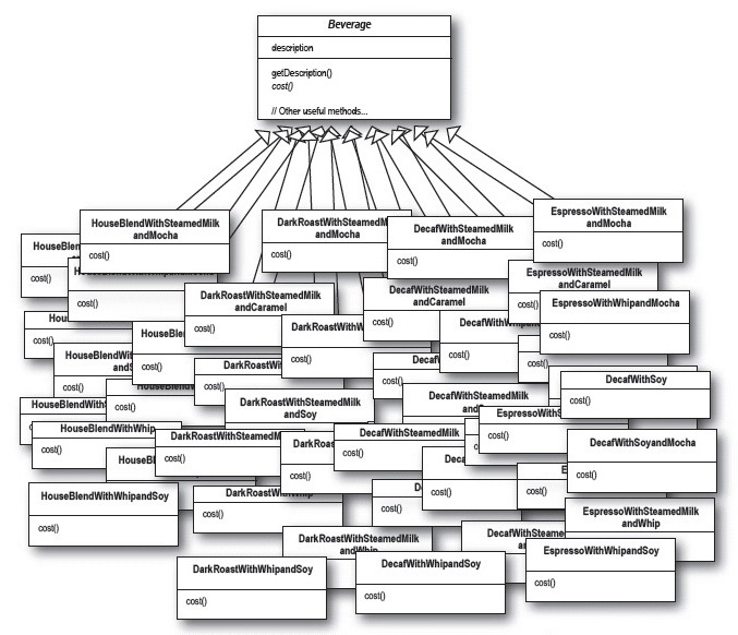 아마 데코레이터 패턴을 알지 못하시는 분들은 "공통 인터페이스를 만든 뒤, 구현하면 되죠!!"라고 말씀을 하실 것이라고 생각됩니다. 밑의 그림은 책에 나온 예시입니다. 비록 햄버거는 아니었지만 커피를 예시로 다이어그램을 그린 그림입니다. 정말 수많은 클래스들이 하나의 인터페이스를 구현하는 모습을 볼 수 있습니다.