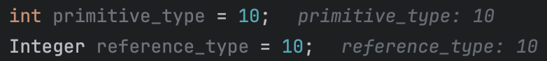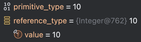 실제로 원시 타입의 변수와 참조 타입의 변수를 만들어서 값을 넣어본 결과 하기의 사진과 같이 원시 타입의 경우 값이 조회되고, 참조 타입의 경우 Integer@762 즉, 객체의 참조를 통해 값을 가르키고 있는 것을 볼 수 있습니다.