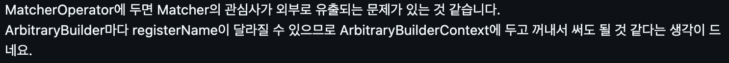 이로 인해 Matcher의 내부 구현 세부 사항이 외부로 노출되는 문제가 발생했습니다.