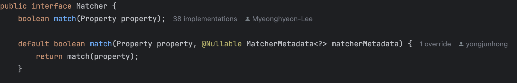 위에 보이는 인터페이스는 Matcher라는 인터페이스이며, 주요한 기능으로는 match 즉, 비교를 하는 기능입니다.