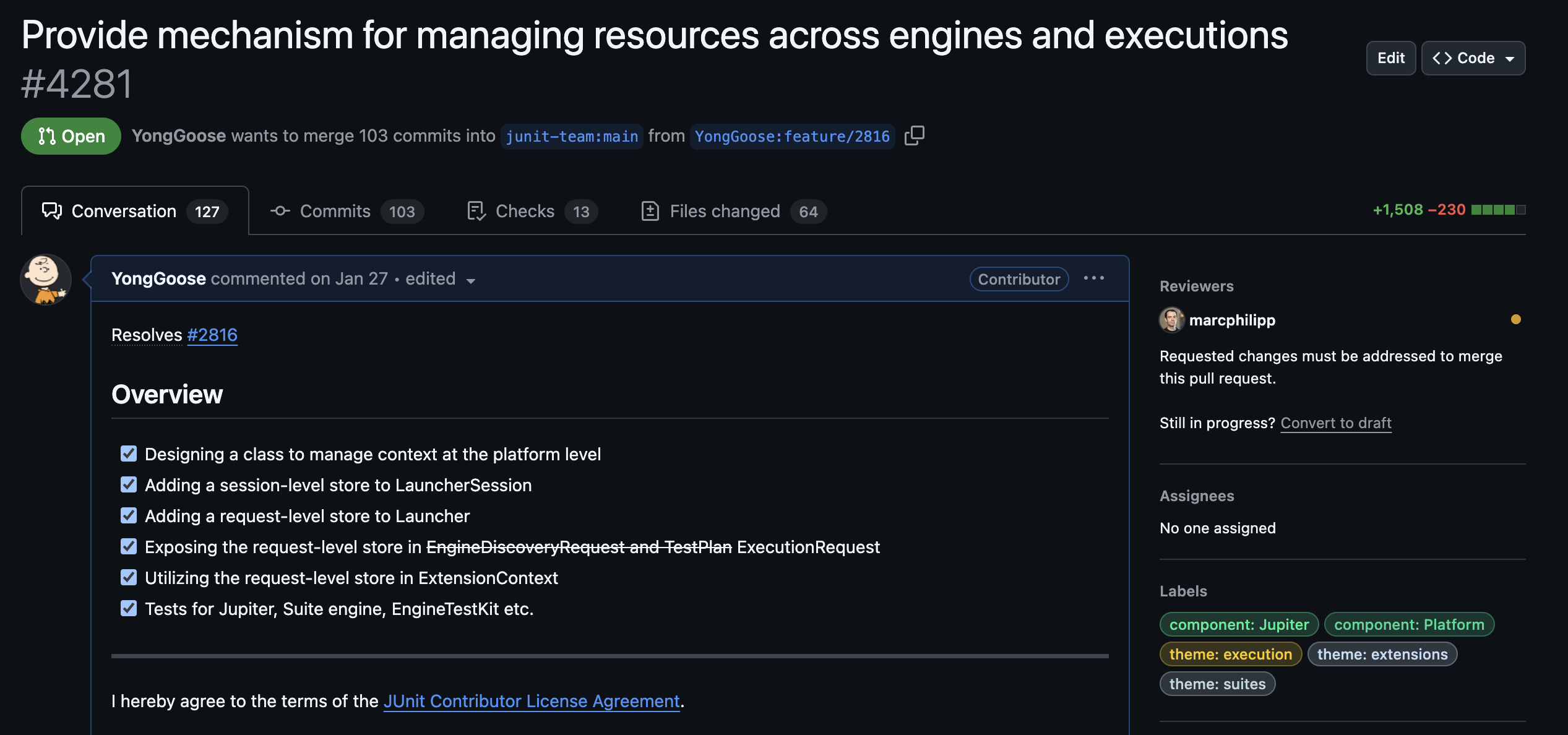 아래의 PR은 JUnit 플랫폼에서 자원 공유를 request / session 이라는 두 가지 범위로 나누어 관리할 수 있도록 하는 기능을 추가하고 있습니다. 이를 통해 자원을 더 세밀하게 제어하고, 테스트 실행 간의 자원의 재사용성을 높이는 것이 목표입니다.