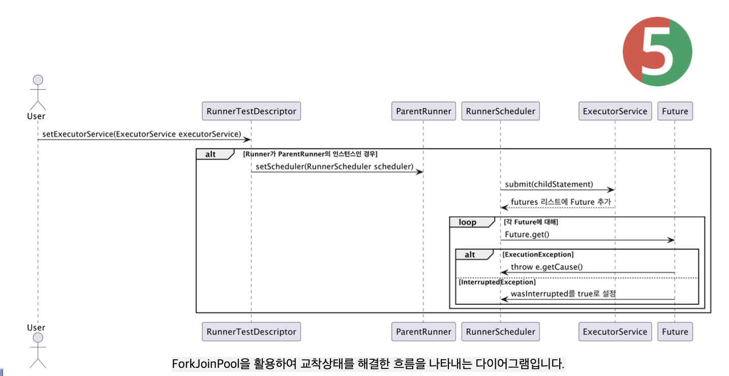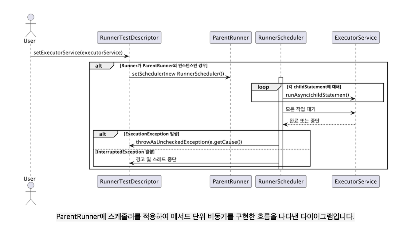 그래서 위 다이어그램과 같이 Runner가 ParentRunner인 경우, 모든 childStatement(메서드)를 스레드 풀을 활용해 비동기로 실행하도록 구현했습니다.