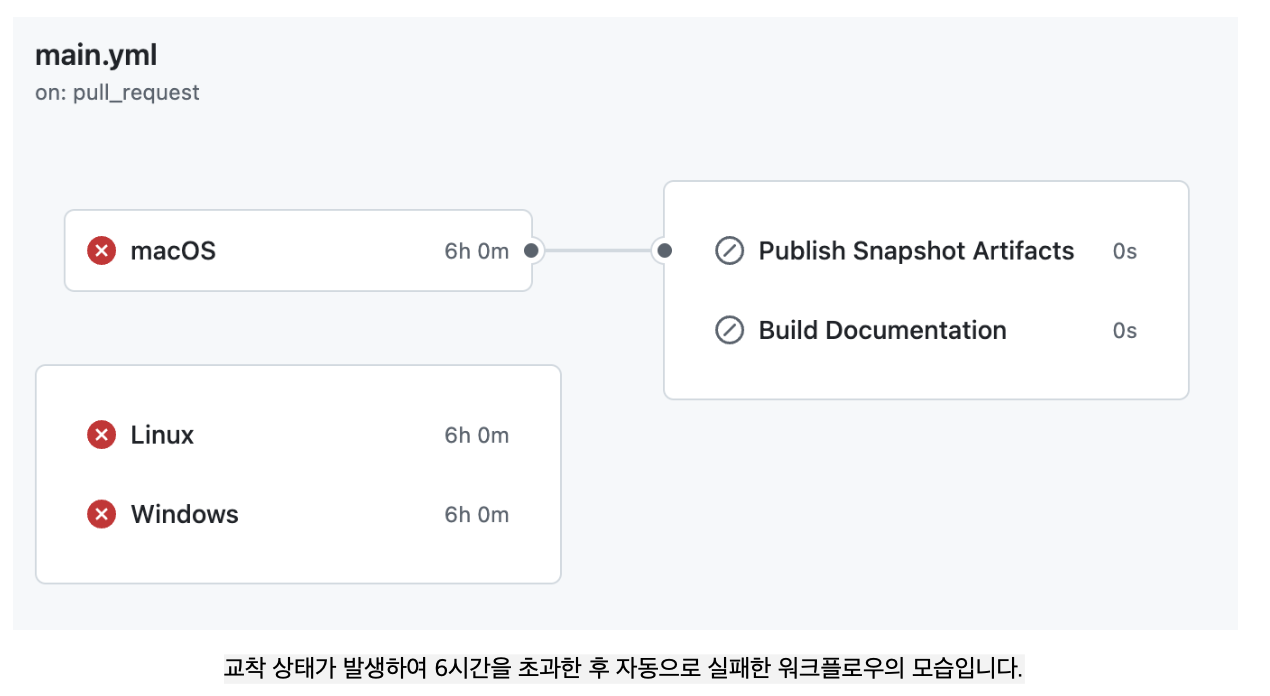 위 이미지는 Github Actions의 워크플로우 결과 이미지인데 6시간 동안 실행을 한 뒤, 시간이 초과되어 자동으로 실패한 것을 볼 수 있습니다.