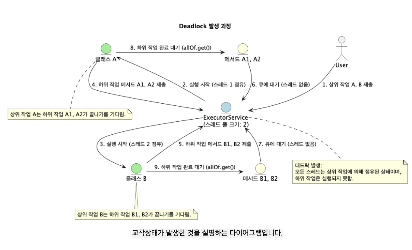 - 점유 대기 : 상위 작업(클래스)은 각각 스레드를 점유한 상태에서 하위 작업(메서드)을 제출하고 완료를 기다립니다.