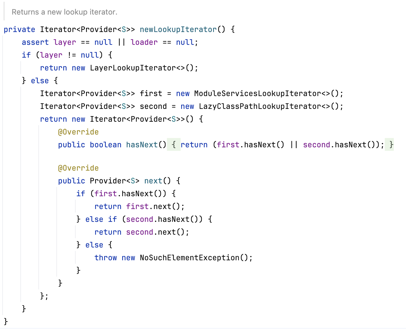 newLookupIterator API는 ModuleServicesLookupItertor, LazyClassPathLookupIterator을 사용해 타입에 맞는 요소를 탐색합니다. 이때 탐색 우선순위는 모듈 시스템 → 클래스패스 순입니다.