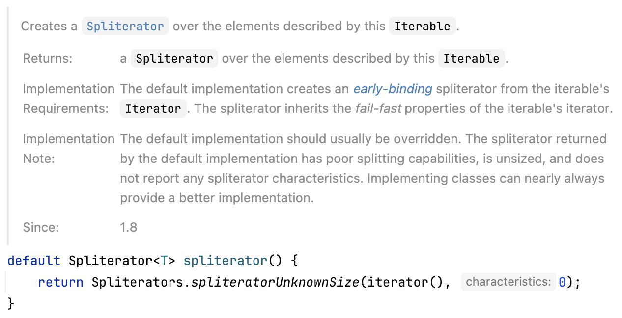 이때 spliterator API를 사용하기 위해선 iterator가 필요한 것을 볼 수 있습니다.