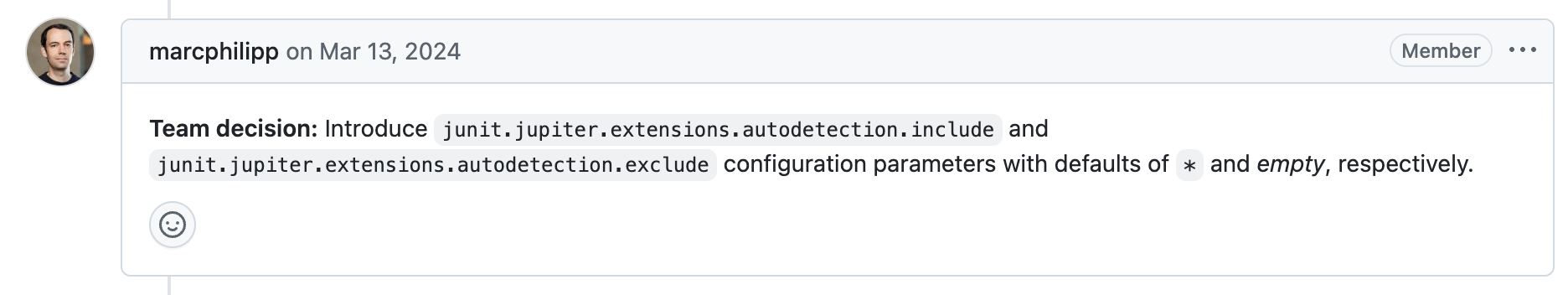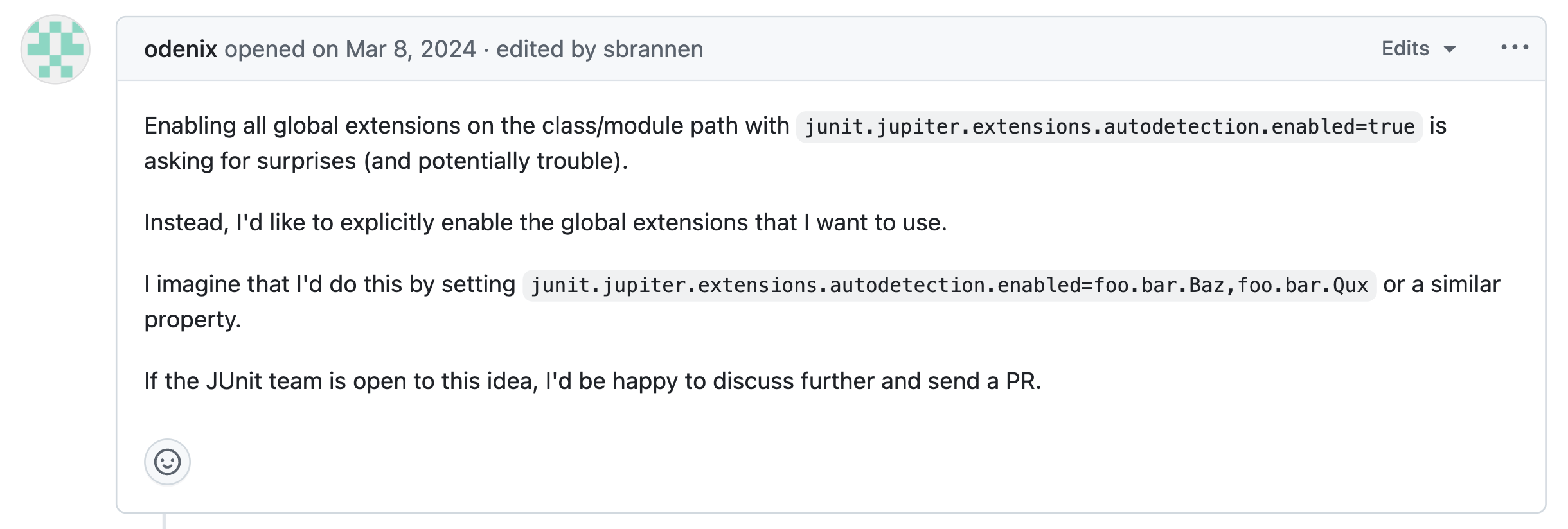 이러한 이슈가 등록되고 5일 후, 메인테이너님께서 JUnit-team 분들과 회의를 하시고, 특정 글로벌 확장을 선택적으로 활성화할 수 있도록, junit.jupiter.extensinos.autodetection.include / exclude 구성 매개변수를 도입하기로 결정했습니다.